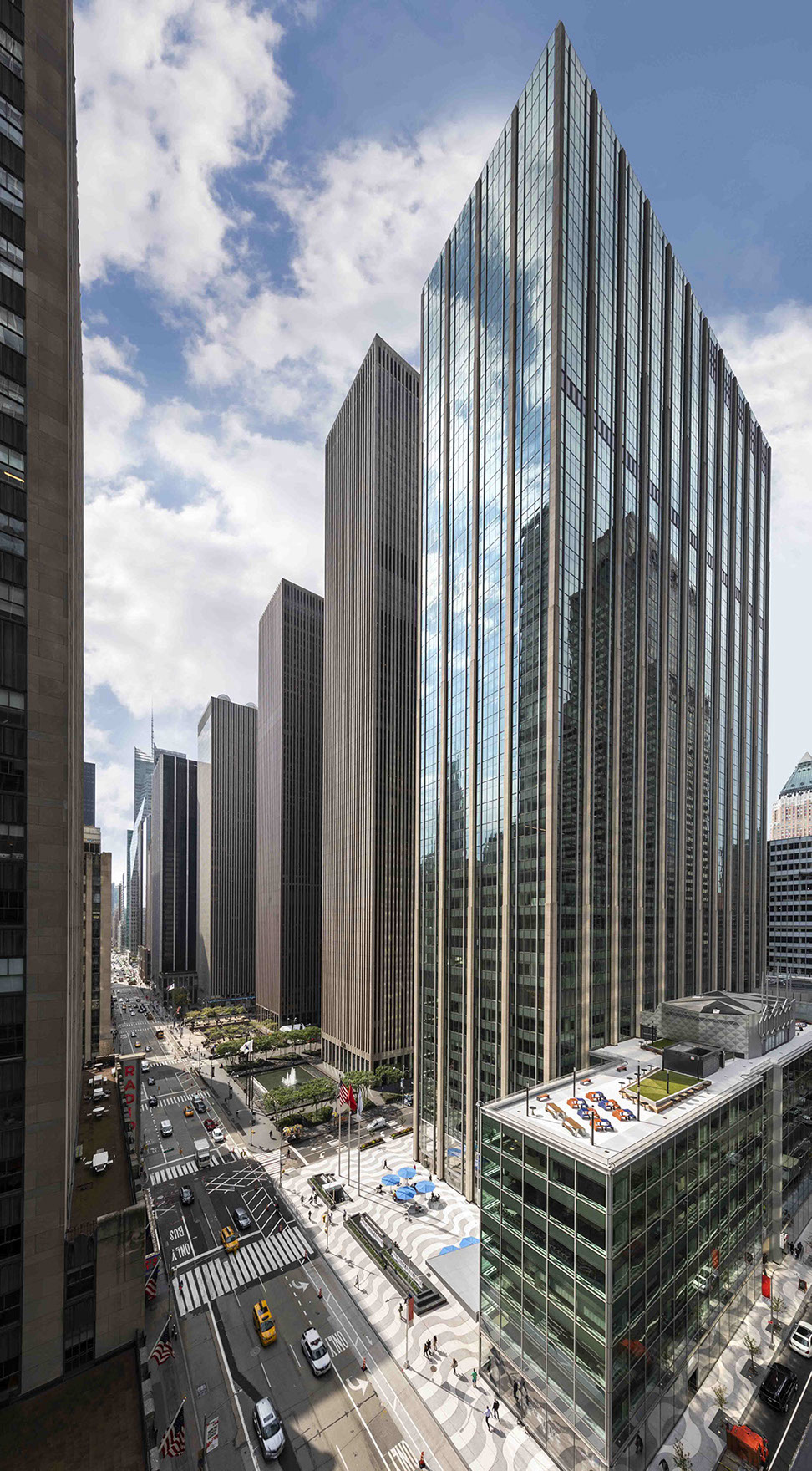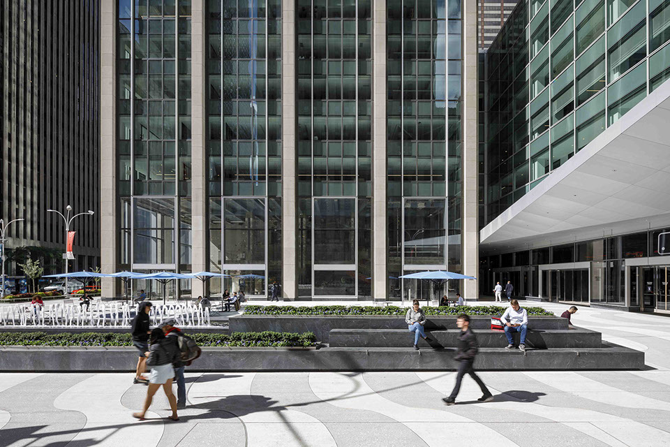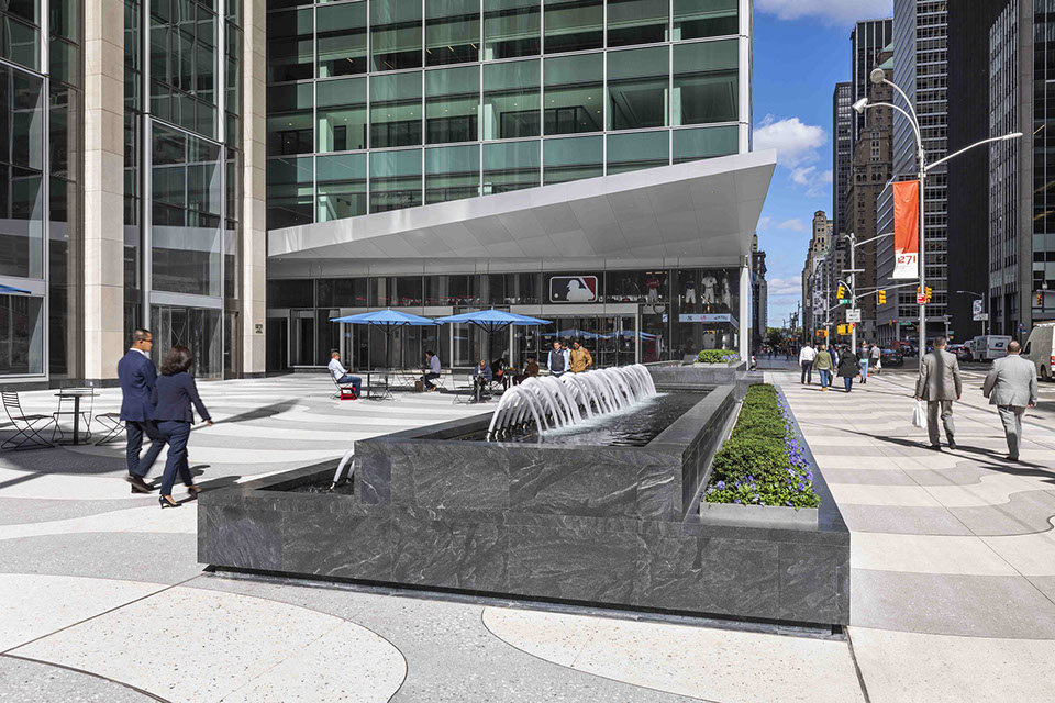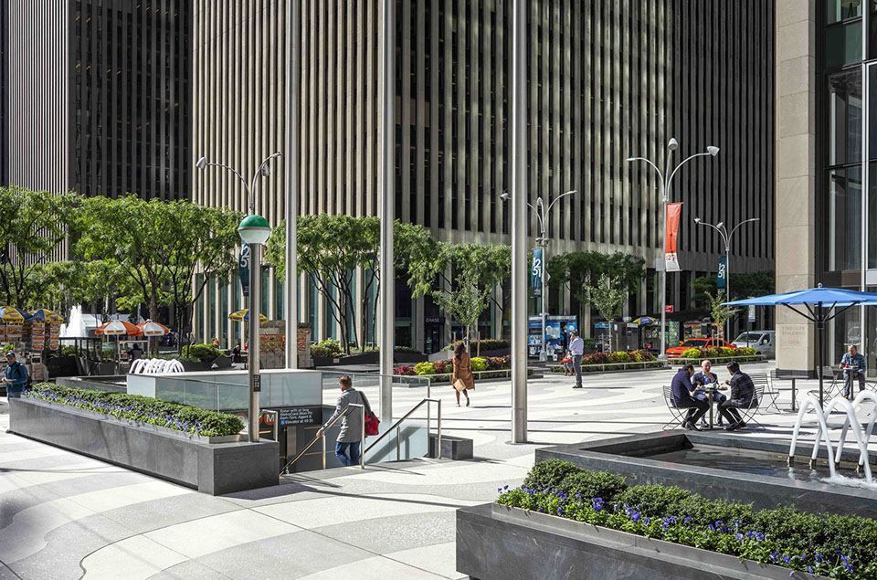Completion Date: 2021 Rockefeller Group Development Corporation, Client Pei Cobb Freed & Partners, Architect Ove ARUP & Partners, Engineer Higgins, Quasebarth & Partners, Preservation Consultant Ken Smith Workshop, Landscape Architect Albert Vecerka / ESTO, Photography 1271 Avenue of the Americas (formerly the Time Life Building) is recognized as a Mid-Century-Modern icon in New York City. The set-back building and urban plaza was one of the first of its type in New York City, and the prototype for the subsequent “X,Y and Z” buildings that were part of the expansion of Rockefeller Center in the early 1960’s. This historically significant building and plaza underwent a sensitive and carefully considered program of restoration, modernization and improvement. The urban plaza renovation, while faithful to the original 1959 design concepts, introduced a number of significant improvements and adjustments to the original design. Reconfiguring the front plaza and water feature was the biggest public space challenge. The original plaza fountain was a rectangular pool attached to the face of the tower’s façade. Proportionally this created an awkward plaza space that was neither sidewalk nor configured plaza space. To redress this issue a new stepped feature that combined water fountain element, seating and planting was designed to mediate between the sidewalk and the plaza. There were significant design challenges in the renovation of the plaza paving, street trees, and reconfigured water feature. The plaza, with its signature serpentine paving pattern inspired by the sidewalks at Copacabana Beach in Rio de Janeiro, creates a unique sense of place in the Rockefeller Center district. This project transformed the entire plaza—replacing the original large fountain with smaller-scale elements that are more pedestrian-friendly, and adding a new breezeway connecting Sixth Avenue to the main lobby. The paving pattern unifies both building lobby interior and the exterior plaza areas and was originally constructed of matching terrazzo material, which ultimately did not weather well in the NYC climate and was replaced in the early-1990’s with a “rustic terrazzo” installation, which also failed to wear well over time. The challenge was to match the material and finish of the exterior paving to the interior lobby finish with paving construction that would weather well. This was done by developing a custom high-test reinforced cast-in-place pigmented concrete with integral marble aggregate that was surface ground to expose the marble chips. The paving dividers strips to separate the color bands in the paving were custom fabricated with durable ¼-inch wide stainless-steel bands. There was significant research and development involved in the process, multiple samples and a full-scale 30’x30’ mock-up to test the paving design.