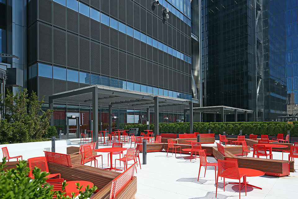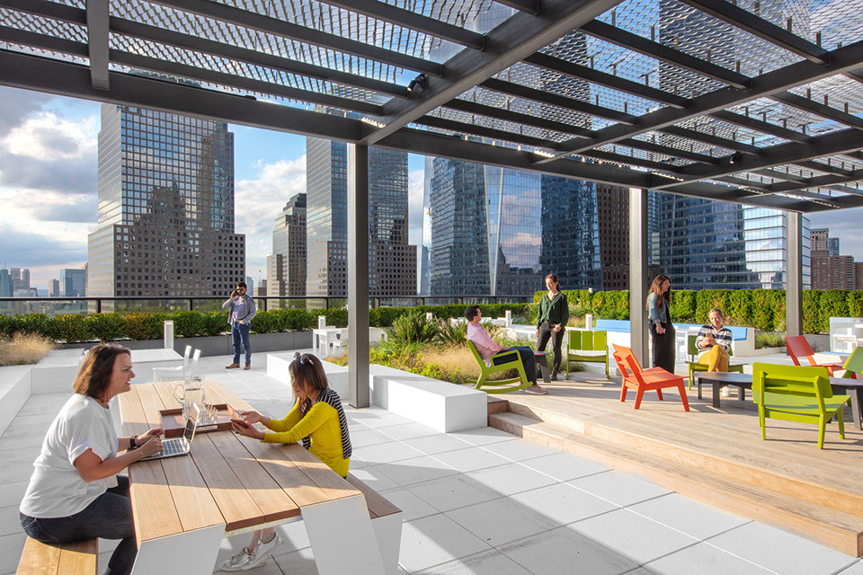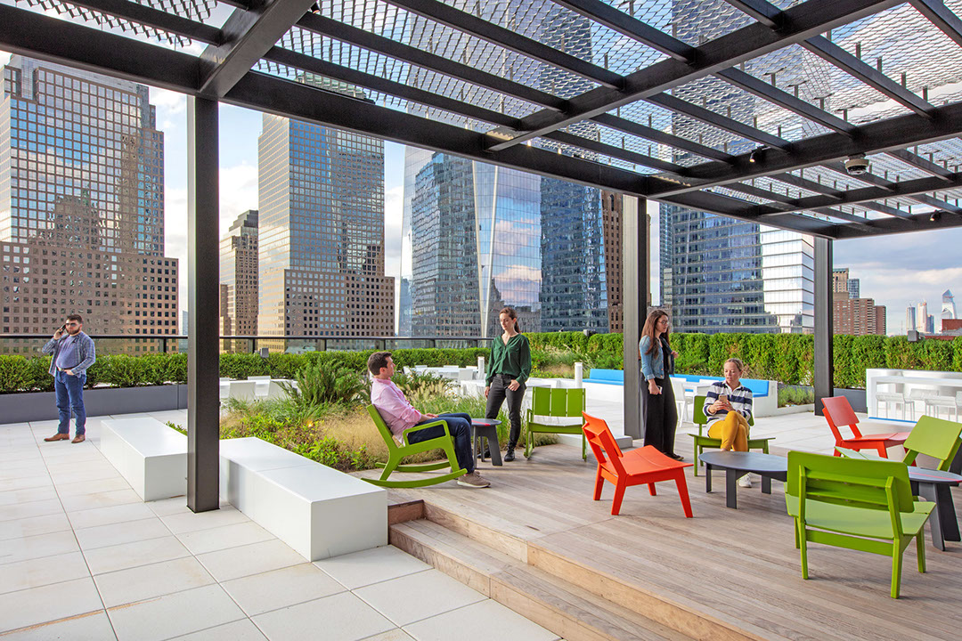 Start Date: 2018 Completion Date: 2019 Croup M, Client Silverstein Properties, Client Ken Smith Workshop, Landscape Architect above photography - Eric Laignel below photography 1 - Eric Laignel below photography 2, 3 - Joe Woolhead The 11th floor terrace of the building overlooking the WTC 2001 Memorial site was developed with two amenity terraces. One terrace provides private space for Group M employees and the other communal outdoor space for the other building tenants. Both terraces are shielded from wind downdrafts by wind abatement canopies that also provide for human scale at the base of the tower. Both terraces are framed by hedges and meadow plantings. The Group M terrace has a raised wood deck, built-in and movable seating. The Silverstein communal terrace is designed a flexible space with a reconfigurable family of modular seating elements.