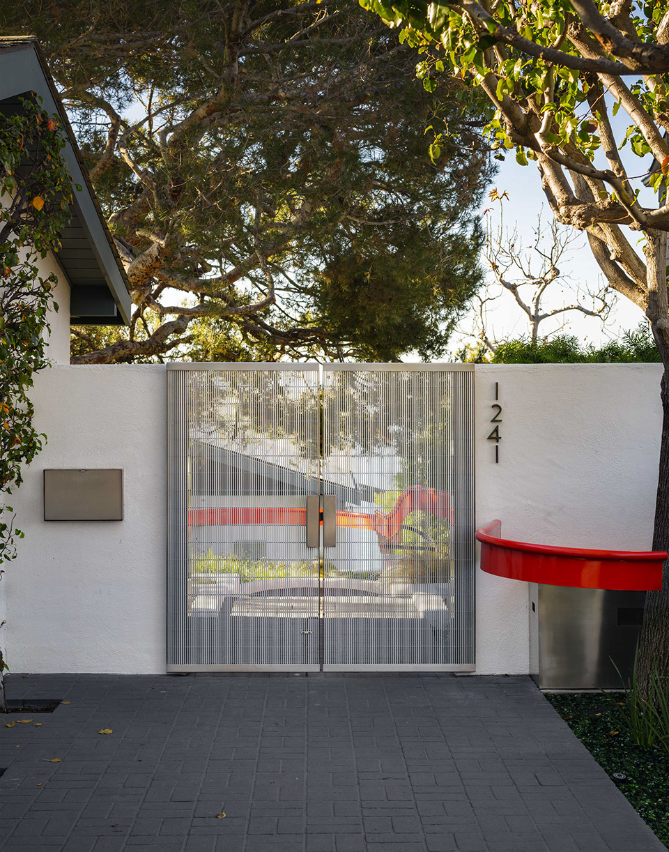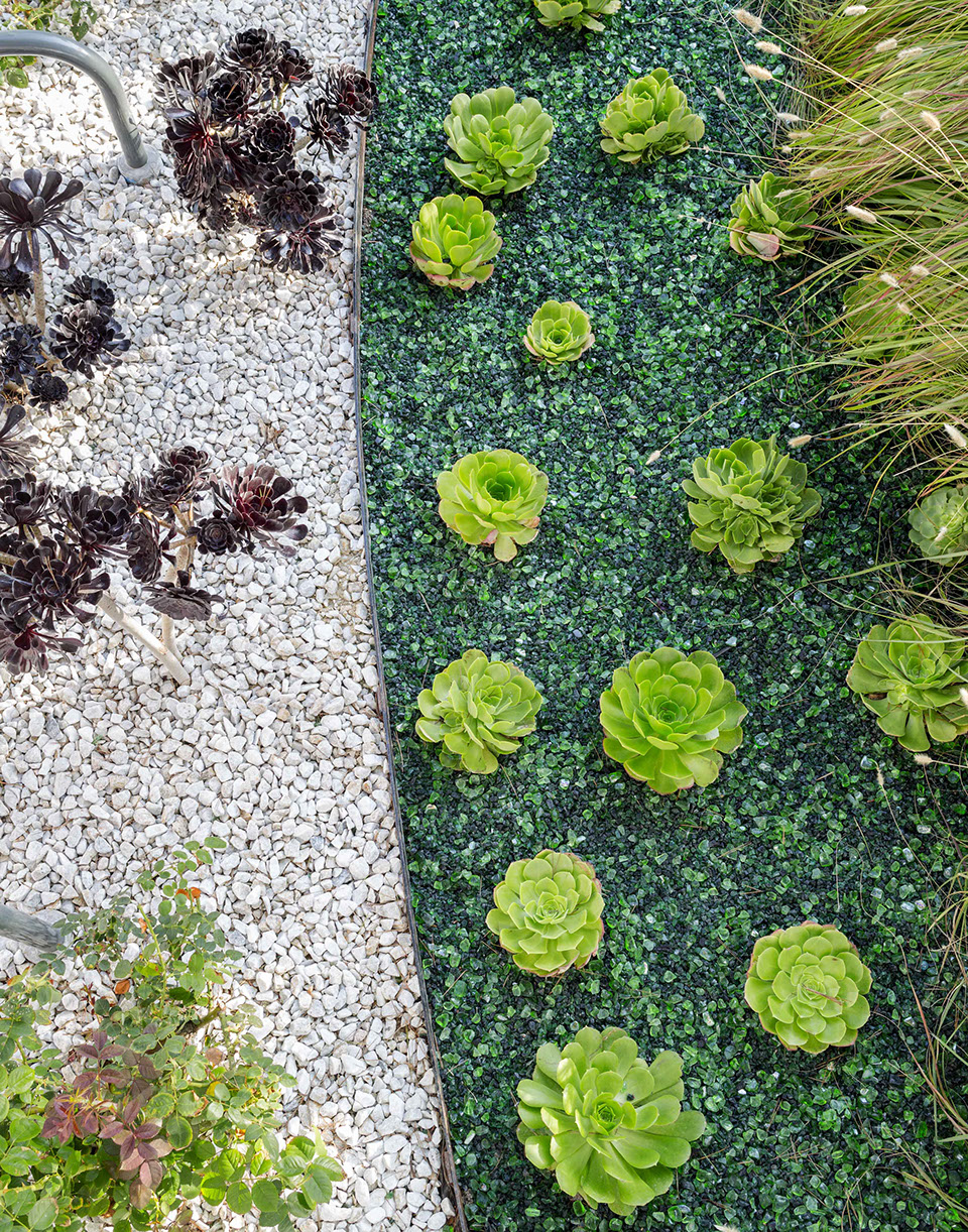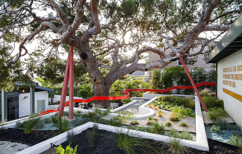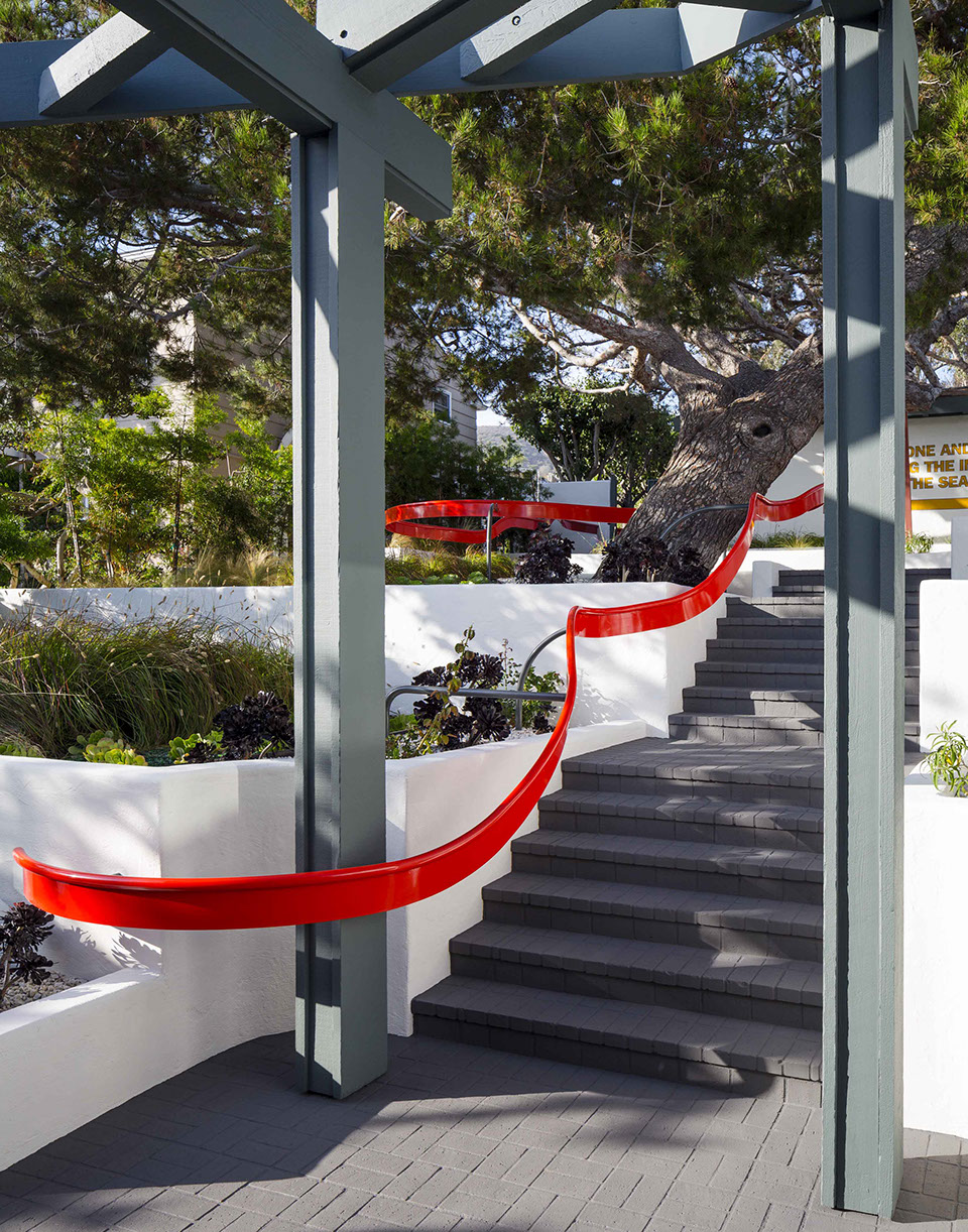Start Date: 2010 Completion Date: 2013 Trevor Tondro, Photography This is a landscape intervention of strategically adding a sculptural new handrail and replanting existing terraces with a parterre of drought tolerant plantings. The garden sits between a street front garage at the top of the property and the house, which sits at a lower elevation facing the Pacific Ocean. A nine-foot grade change separates the garage and the house. The program called for a new hand rail, better lighting along the path way and for a distinctive garden that would function as part of their art collection. The railing rigorously follows the vertical dimensions of the steps and landings for functional purposes but is freer and more expressive in form in its horizontal curves.