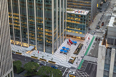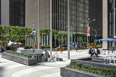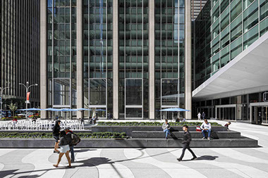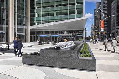 1271 Avenue of the Americas  NYC Completion Date: 2021 Rockefeller Group Development Corporation, Client Pei Cobb Freed & Partners, Architect Ove ARUP & Partners, Engineer Higgins, Quasebarth & Partners, Preservation Consultant Ken Smith Workshop, Landscape Architect Albert Vecerka / ESTO, photography 1271 Avenue of the Americas (formerly the Time Life Building) is recognized as a Mid-Century-Modern icon in New York City. The set-back building and urban plaza was one of the first of its type in New York City, and the prototype for the subsequent “X,Y and Z” buildings that were part of the expansion of Rockefeller Center in the early 1960’s. This historically significant building and plaza underwent a sensitive and carefully considered program of restoration, modernization and improvement. The urban plaza renovation, while faithful to the original 1959 design concepts, introduced a number of significant improvements and adjustments to the original design. Reconfiguring the front plaza and water feature was the biggest public space challenge. The original plaza fountain was a rectangular pool attached to the face of the tower’s façade. Proportionally this created an awkward plaza space that was neither sidewalk nor configured plaza space. To redress this issue a new stepped feature that combined water fountain element, seating and planting was designed to mediate between the sidewalk and the plaza. There were significant design challenges in the renovation of the plaza paving, street trees, and reconfigured water feature. The plaza, with its signature serpentine paving pattern inspired by the sidewalks at Copacabana Beach in Rio de Janeiro, creates a unique sense of place in the Rockefeller Center district. This project transformed the entire plaza—replacing the original large fountain with smaller-scale elements that are more pedestrian-friendly, and adding a new breezeway connecting Sixth Avenue to the main lobby. The paving pattern unifies both building lobby interior and the exterior plaza areas and was originally constructed of matching terrazzo material, which ultimately did not weather well in the NYC climate and was replaced in the early-1990’s with a “rustic terrazzo” installation, which also failed to wear well over time. The challenge was to match the material and finish of the exterior paving to the interior lobby finish with paving construction that would weather well. This was done by developing a custom high-test reinforced cast-in-place pigmented concrete with integral marble aggregate that was surface ground to expose the marble chips. The paving dividers strips to separate the color bands in the paving were custom fabricated with durable ¼-inch wide stainless-steel bands. There was significant research and development involved in the process, multiple samples and a full-scale 30’x30’ mock-up to test the paving design.