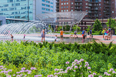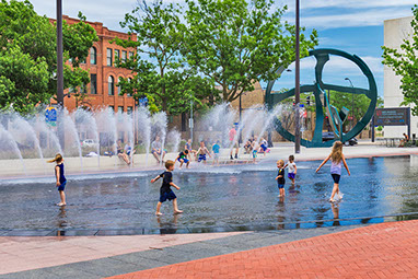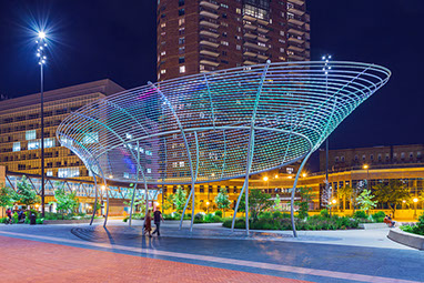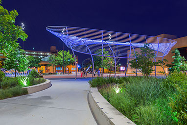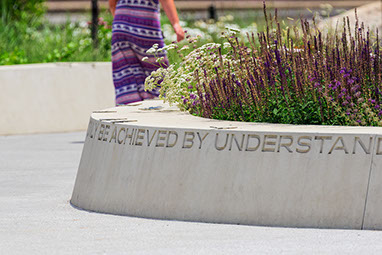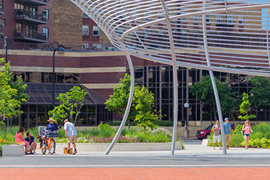 Cowles Commons  Des Moines, IA Start Date: 2008 Completion Dates: 2015 Des Moines Performing Arts, client RDG Planning & Design, local landscape architect Cal Lewis, architect Jim Campbell, artist Fluidity Design, fountain design Jim Conti, lighting design Urban Trees and Soils, tree consultant homepage photograph - "Max" Kuh Zhang above image - The Des Moines Register / Ken Smith Workshop below photographs - Iris22 A $12 million redevelopment to revitalize Des Moines’ 2.5-acre historic square. The new Cowles Commons is a flexible use space designed to support a range of downtown programs and activities ranging from daily use to outdoor markets, concerts, performing arts productions, special events and downtown civic space celebrations. The design juxtaposed two alignments to organize the space. One alignment is the downtown grid aligned with the river and the other the greater city grid based on the Jefferson national survey. A boldly striped plaza of red brick and stone aligned with the diagonal alignment and a new interactive fountain are the centerpiece of the design. Framing both sides of the plaza are ovoid-shaped gardens planted with native Oak and Hickory and prairie grasses and wildflowers. Low seat walls are inscribed with peace quotes. Artist Jim Campbell was commissioned to create a major new environmental light sculpture.