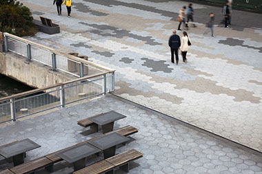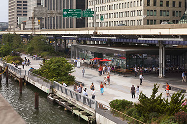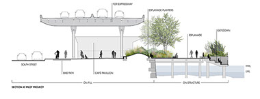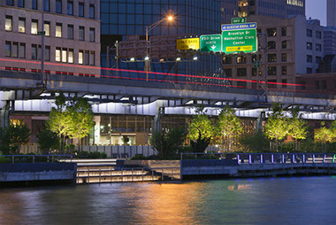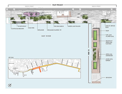 East River Waterfront Esplanade  NYC Start Date: 2004 - ongoing NYC Economic Development Corporation, Client SHoP, Architects HDR/Arup, Engineering Tillotson Design Associates, Lighting Design Peter Mauss / ESTO, Photography bottom images (plan and section) - Ken Smith Workshop The two-mile site sits partially beneath the elevated highway and partially over water on marine platform structure and includes reconstruction of Piers 15 and 35. The open space program includes a continuous public esplanade for bicycles and pedestrians, improved connections to the adjoining neighborhoods, and needed open space amenities. Public features tucked under the elevated highway structure include restaurant pavilions, dog run, exercise platforms, swings, ball courts, skateboard area and seating areas. Water edge features include fishing balconies, a stepped tidal get down area, overlooks and an innovative mussel habitat demonstration area, aka “Mussel Beach.”