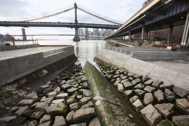 East River Waterfront: Mussel Beach  NYC Start Date: 2004 Completion Date: 2013 NYC Economic Development Corporation, Client SHoP, Architects HDR/Arup, Engineering Tillotson Design Associates, Lighting Design Peter Mauss / ESTO, Photography The two-mile site sits partially beneath the elevated highway and partially over water on marine platform structure and includes reconstruction of Piers 15 and 35. The open space program includes a continuous public esplanade for bicycles and pedestrians, improved connections to the adjoining neighborhoods, and needed open space amenities. Public features tucked under the elevated highway structure include restaurant pavilions, dog run, exercise platforms, swings, ball courts, skateboard area and seating areas. Water edge features include fishing balconies, a stepped tidal get down area, overlooks and an innovative mussel habitat demonstration area, aka “Mussel Beach.”