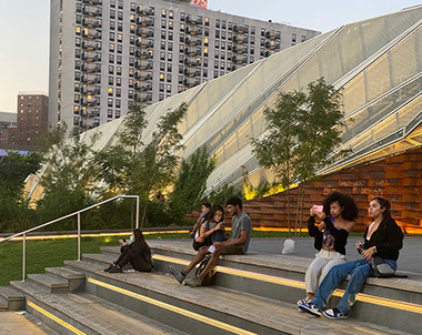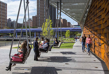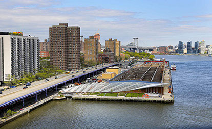 East River Waterfront Pier 35  Manhattan, NYC Completion Date: 2019 Owner: City of New York, Economic Development Corporation Design Team: SHoP, Architects Ken Smith Workshop, Landscape Architect David Sundberg / ESTO, Photography The new eco-park at Pier 35 anchors the northern boundary of the two-mile long East River Waterfront Esplanade and Piers project, providing much-needed outdoor space for the local community along the waterfront and acting as an innovative habitat restoration park. The folded terrain creates a series of dunes and lawns and the folded topiary vine structure masks the adjacent sanitation building. At the west end a pedestrian bridge crosses over a folded tidal “Mussel Beach” eco project, and at the east end a raised platform with “urban porch swings” affords commanding view of the lower Manhattan and Brooklyn waterfronts. The 60,000 square foot pier features an accordion-like design, creating the sense of a “folded” terrain. A series of landscaped lawns and dunes create a walkway, while an inclined, plant-covered folded screen wall acts as a “green” billboard to the city. Rising to a height of 35 feet and stretching over 300 feet in length, the screen wall also effectively camouflages the adjacent Sanitation Department shed at Pier 36 along FDR Drive in Lower Manhattan. The use of live materials, such as the metal screen and weathered steel wall panels is reminiscent of the East River’s history as a working waterfront. A raised porch with custom swings provides a place to relax and take in the views of the Brooklyn and Manhattan Bridges, and Brooklyn Bridge Park. The resulting design provides an often-overlooked section of the East River esplanade with a lush, landscaped outdoor space for passive relaxation and enjoyment. This public park builds on a rich past to turn the face of the city once more to the water and provides yet another step in the renewal of New York.