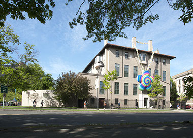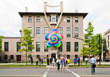 Fenway Deity  Isabella Stewart Gardner Museum  Boston, MA Start Date: 2014 Completion Date: 2015 Isabella Stewart Gardner Museum, Client BuroHappold, Engineering George Bouret, Photography The Fenway Deity is the latest in numerous temporary installations Ken Smith has executed over the past 25 years. Temporary installations have been a core R&D method in the Workshop to explore new ideas about landscape. The Fenway Deity explores the relationship between the Gardner Museum and the Boston Fenway, and the interrelatedness of environmental and cultural vitality in the health of urban areas. The large inflatable installation, with a psychedelic spiral pattern and gold chain, hung for four months from the historic façade of the Museum facing the Boston Fens. The Deity riffs on the Gardner’s large wheel window on the building’s rear façade, forming a transect line through the Museum, between the window and the installation. The Deity creates a new conduit for the Museum’s creative energy to protect the Fens from bad spirits and promote environmental renewal, health, and happiness along the Fenway and beyond.