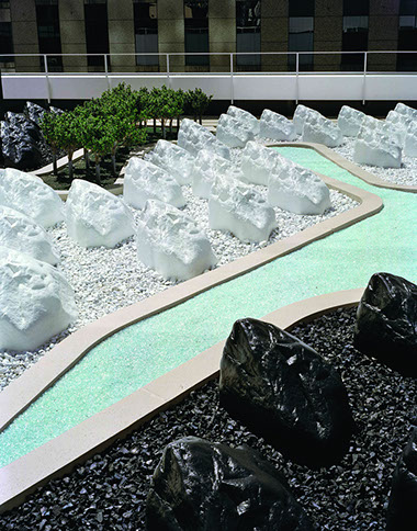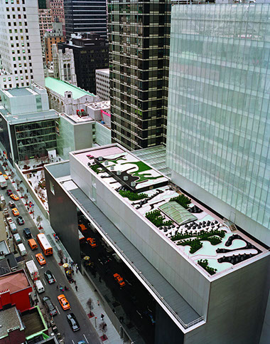 Roof Garden  Museum of Modern Art  NYC Start Date: 2002 Completion Date: 2005 Museum of Modern Art, Client Yoshio Taniguchi, Architect Kohn Pederson Fox, Architect Peter Mauss / ESTO, Photography Ken Smith designed this art-oriented roof garden for the new Taniguchi-designed addition to the museum. The design of the roof garden appropriates the visual vocabulary of military camouflage to create a garden that simultaneously disguises the roof while making it highly visible. The design also provides commentary on the nature of landscape with its manipulation of scale and use of natural and simulated materials. The material palette includes recycled rubber chips, crushed glass, crushed marble stone, artificial boulders and artificial boxwood shrubs.