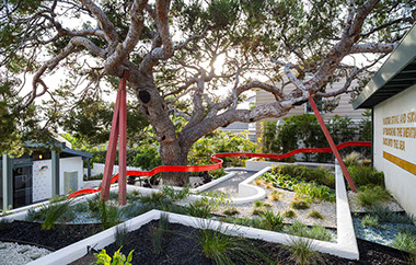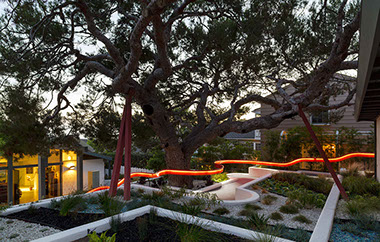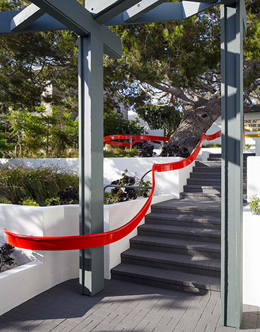 Pacific Coast Residence  Laguna Beach, CA Start Date: 2010 Completion Date: 2013 Trevor Tondro, Photography This is a landscape intervention of strategically adding a sculptural new handrail and replanting existing terraces with a parterre of drought tolerant plantings. The garden sits between a street front garage at the top of the property and the house, which sits at a lower elevation facing the Pacific Ocean. A nine-foot grade change separates the garage and the house. The program called for a new hand rail, better lighting along the path way and for a distinctive garden that would function as part of their art collection. The railing rigorously follows the vertical dimensions of the steps and landings for functional purposes but is freer and more expressive in form in its horizontal curves.