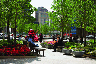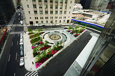 Silverstein Family Park at 7 World Trade  NYC Start Date: 2002 Completion Date: 2004 Silverstein Properties, Client The Port Authority of New York, Client SOM, Architect Cantor Seinuk, Engineering Jaro Baum & Bolles, Engineering Phillip Habib and Associates, Engineering Cline Bettridge Bernstein, Lighting Design Peter Mauss / ESTO, Photography The half-acre triangular park at Seven World Trade Center consists of a central open space with a fountain and flanking groves of trees and shrubs. The space is both a ceremonial forecourt to the new building and a social space for office workers and the local neighborhood.