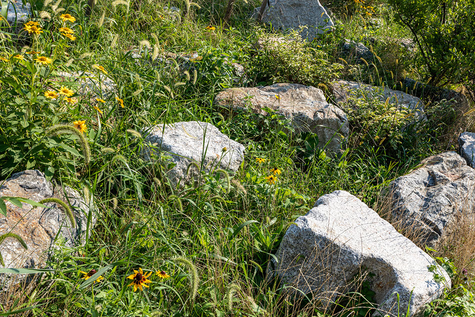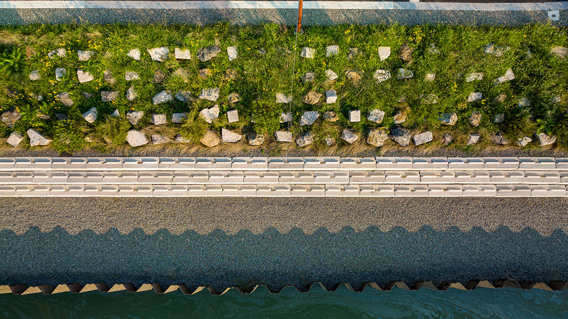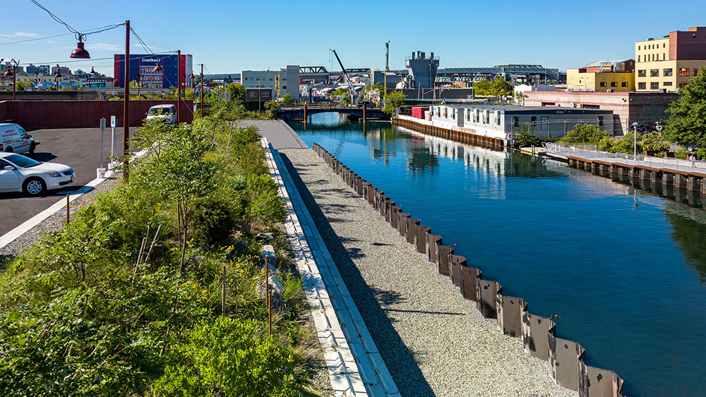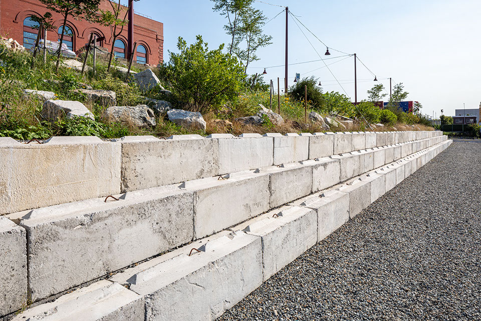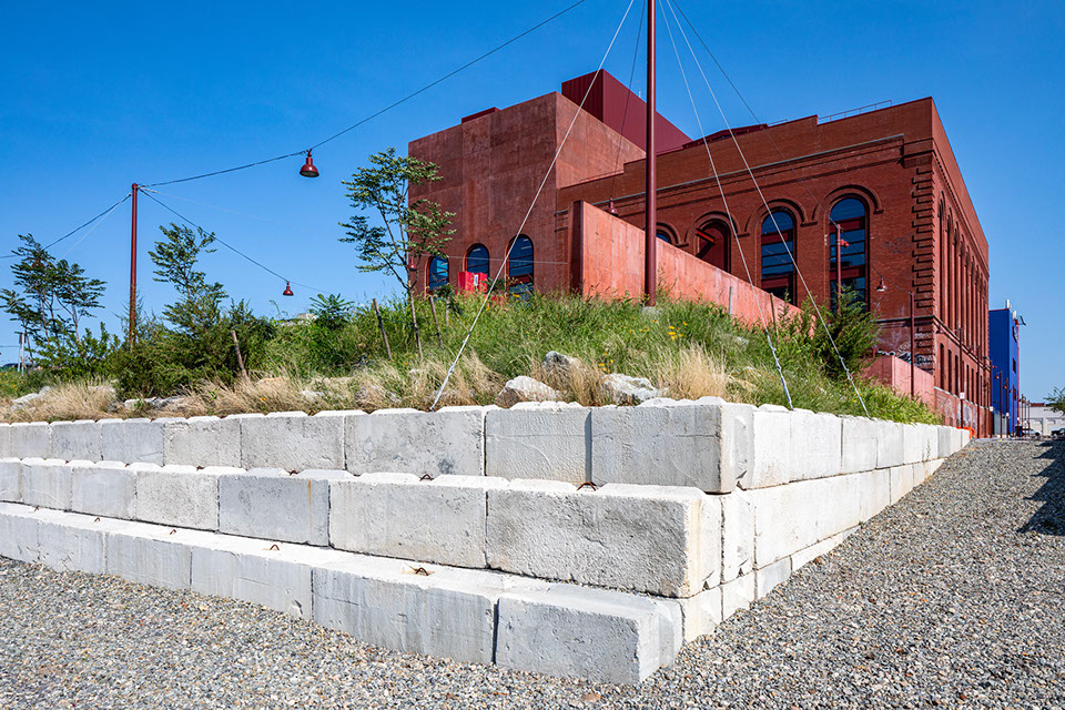 Start Date: 2021 Powerhouse Arts, Client Herzog & de Meuron and PBDW Architects, Architect Ken Smith Workshop, Landscape Architect Barrett Doherty, Photography Powerhouse Arts is a not-for-profit contemporary center for multi-disciplinary artist workshops and fabrication facilities and occupies a significant historic site and structure, formerly the central power station of the Brooklyn Rapid Transit Company. The landmark structure sits prominently on the 2.5-acre canal site and is a significant landmark in Brooklyn’s memory and history. As part of an intensive brownfield site cleanup and major historic building renovation, the site design reinterprets materials and forms to evoke the industrial uses formerly found along the canal and recalls the wild quality of emergent successional ecology resulting from years of neglect. Principal design goals involve reflecting the site’s history and sense of place while addressing contemporary issues of coastal resiliency and waterfront access. Remediation efforts included removing site soils, capping, importing new fill material and reconstructing the decayed seawall. While site remediation required removal of contaminated material, the design goal was to not strip the site of its significance and history. New landscape features include a completely reconstructed and reshaped waterfront edge with reuse and celebration of common industrial materials. Changes in sea levels and increased incidents of storm surges and flooding on the canal were primary considerations that drove the design, resulting in the site being raised up to protect the building from flooding. The waterfront edge has been reshaped and elevated 15 feet. To accomplish this, new sheet pile sea wall was installed alongside a generous pedestrian walkway, which is backed by a sittable stepped concrete block revetment and a sloped landform of boulders and plantings.